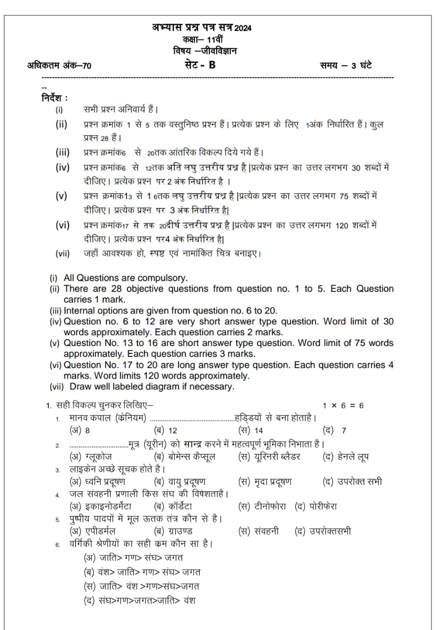 MP Board Class 11th Biology Half Yearly Paper 2025-Overview