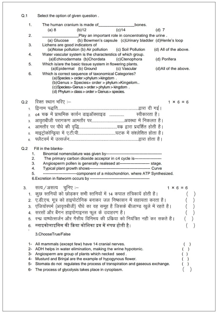 MP Board Class 11th Biology Ardhvarshik Priksha Paper Pdf 2025