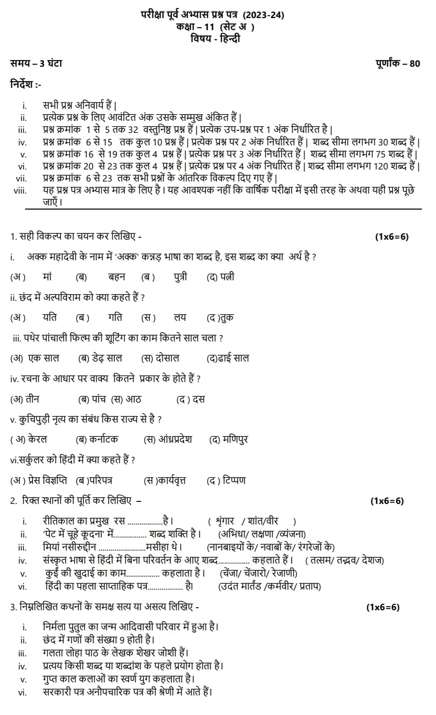 MP Board Class 11th Hindi Ardhvarshik Paper पीडीऍफ़ Download 2025
