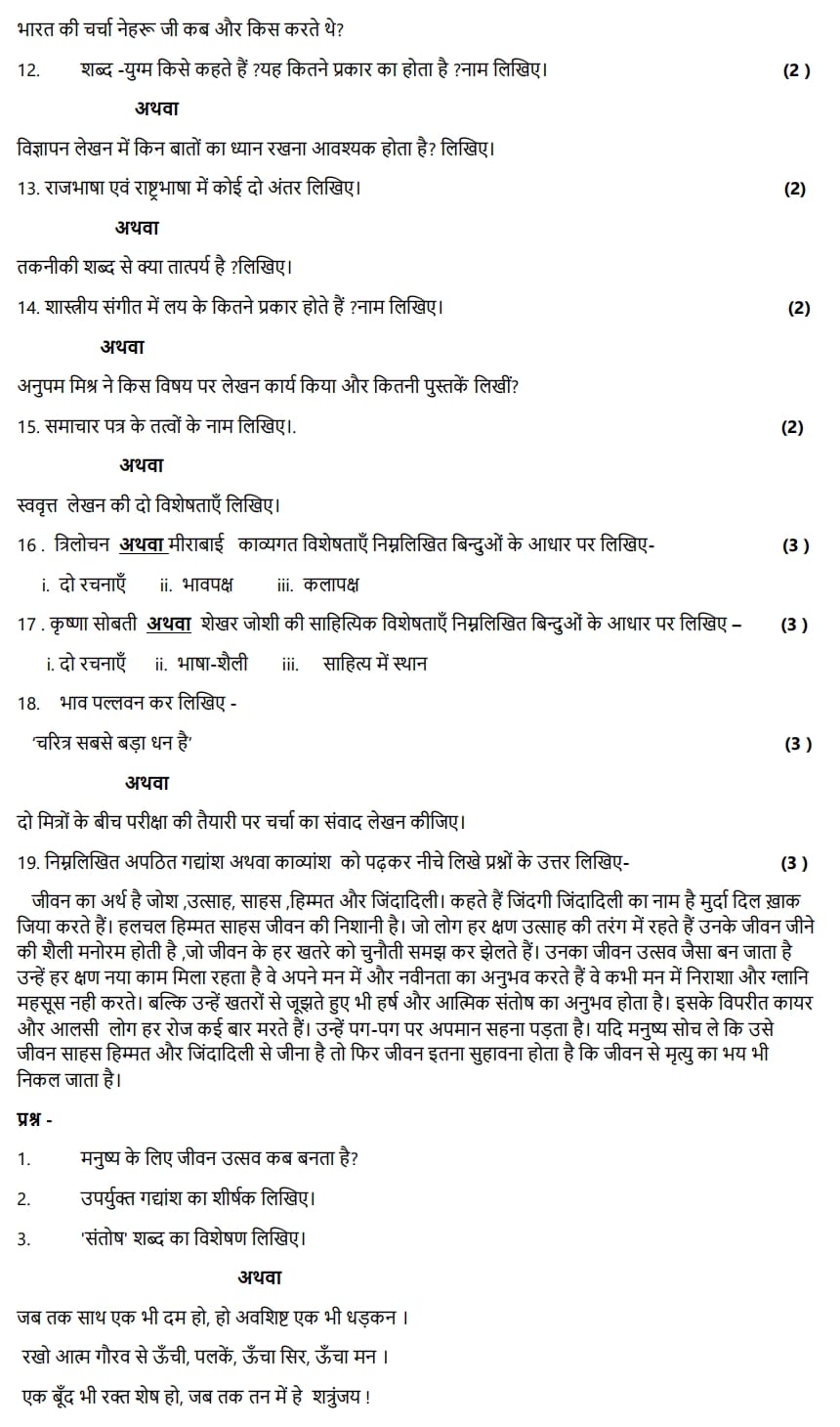 MP Board Class 11th Hindi Model Paper 2025