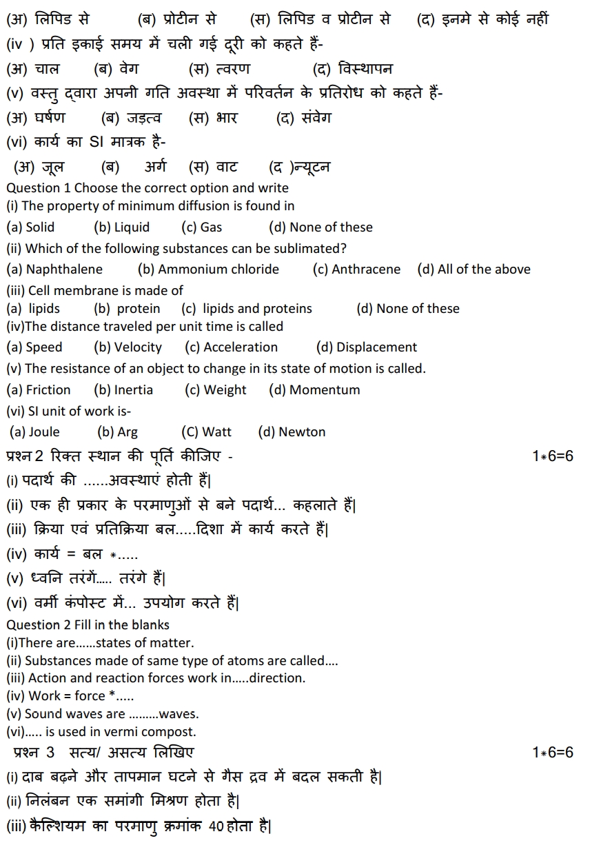 MP Board Class 9th Science Ardhvarshik Paper Pdf 2025