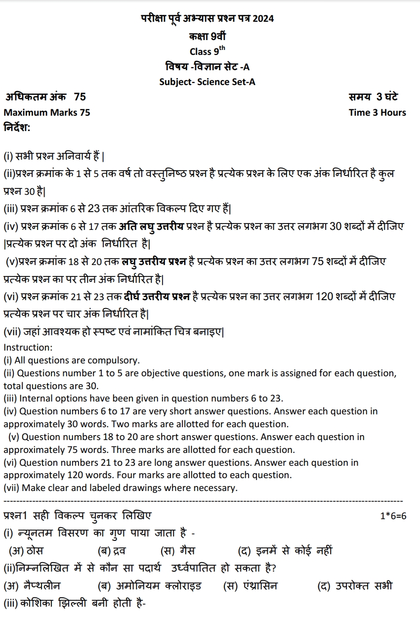 सभी 9 वीं कक्षा के छात्रों के लिए एमपी बोर्ड विज्ञान का ऑफिसियल पेपर पीडीऍफ़ निचे दिया गया है। जिसे चेक करके अपने तैयारी को शुरू कर सकते है।