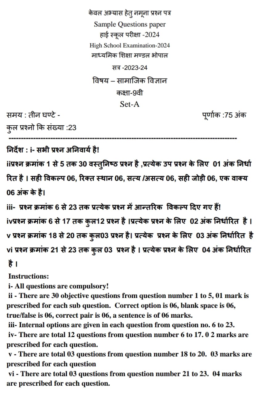 सभी 9 वीं कक्षा के छात्रों के लिए एमपी बोर्ड सामाजिक विज्ञान का ऑफिसियल पेपर पीडीऍफ़ निचे दिया गया है। जिसे चेक करके अपने तैयारी को शुरू कर सकते है।